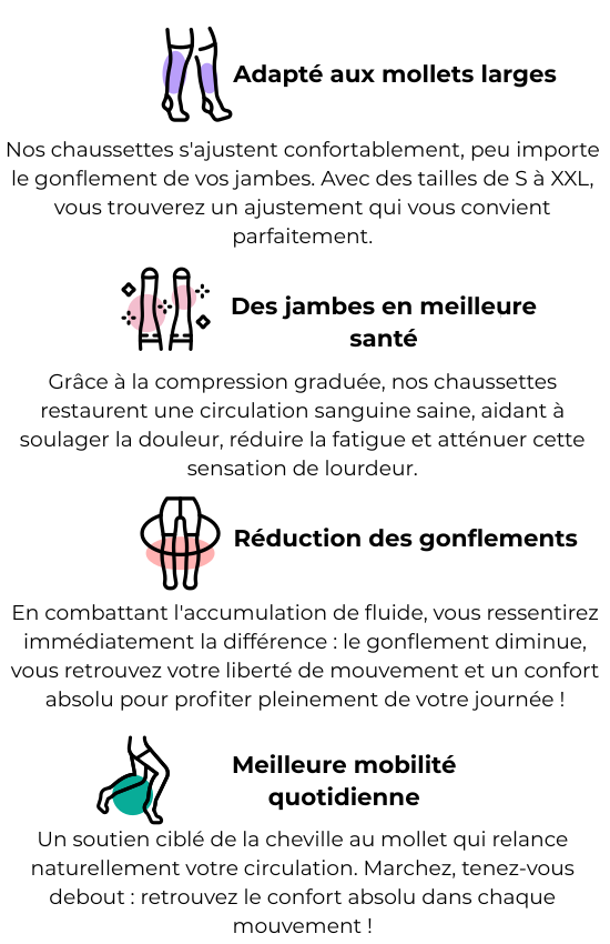 Ils exercent une compression douce et progressive qui améliore la circulation sanguine, réduit l’enflure et atténue l’inconfort au quotidien.